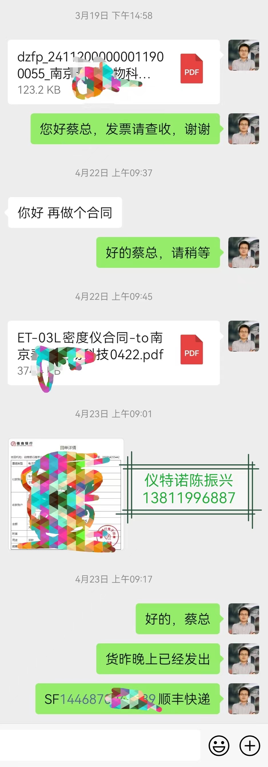 這位液體密度計ET-03L的儀器商老客戶,3月份下單了一臺,4月聯(lián)系直接就讓做合同,一句多余的話也沒有,這信任感是滿滿的?。?